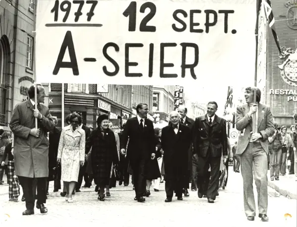 1. mai 1977. Parole: 1977 12. Sept A- Seier. På avisutklipp bakpå: Godt humør og tro på A-seier i høst preget denne delen av Arbeiderpartiets avdeling i demonstrasjonstoget, Midt foran Hjalmar Seim, bystyremedlem for Arbeiderpartiet sammen med tidligere ordfører Brynjulf Bull og ( nesten skjult), STUI sjefen Magnus Nilsen.