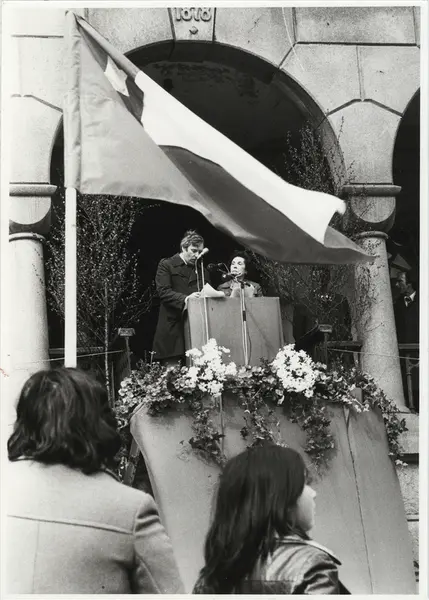 1. mai 1981, Oslo.Tekst til bildet i avisen: Hortensia Allende kom med et kraftig angrep på USAs politikk i Sør-Amerika. Eidar Trulsen fra LOs internasjonale kontor er tolk.