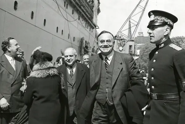 Regjeringen Nygaardsvolds hjemkomst 31. mai 1945..Fra v.: Trygve Lie, Albine Nygaardsvold (med ryggen til), C. J. Hambro, Nils Hjelmtveit ( i bakgrunnen) statsminister Johan Nygaardsvold. Til høyre politiinspektør, senere politimester, Sigurd Svein Skalmerud ved Oslo politikammer. .