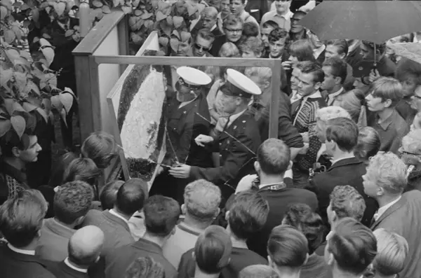 Kjartan Slettemark sitt bilde med tittelen: Av en rapport fra Vietnam:" Barn overskylles av brennende napalm, deres hud brennes til svarte sår og de dør." Mann med øks tok knekken på bildet. Bildetekst i Arbeiderbladet: folkemengden trengte på omkring monteren da politiet brøt opp låsen og fjernet det ødelagte Vietnambildet.
