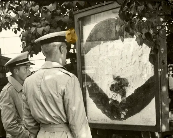 Kjartan Slettemark sitt bilde med tittelen "Av en rapport fra Vietnam: Barn overskylles av brennende napalm, deres hud brennes til svarte sår og de dør." Amerikanske gaster studerer bildet etter at det er hengt opp av kunstneren.
