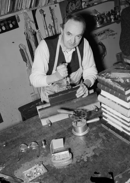 Bokbinder. Danskfødt krigsveteran (anonymisert i reportasjen) - hadde framskutt posisjon i Milorg under krigen. Fikk hjelp til reetablering av sitt bokbinderverksted, som lå i Dalsbergstien 7 på St. Hanshaugen i Oslo, via Kong Haakons fond / Nasjonalhjelpens bevillingsnemd. På veggen henger medaljer og utmerkelser han mottok for sin innsats under krigen. November 1946.
