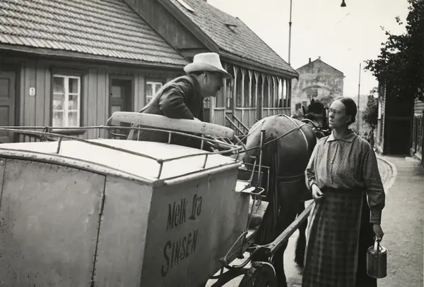 Stillsfoto fra Rasmus Breisteins spillefilm "Ungen" 1938. Ragnhild Hald i rollen som Hønse-Lovisa i samtale med Engebret, spilt av Hauk Gisti - melkekjører fra bryggerifamilien Schous storgård på Sinsen.