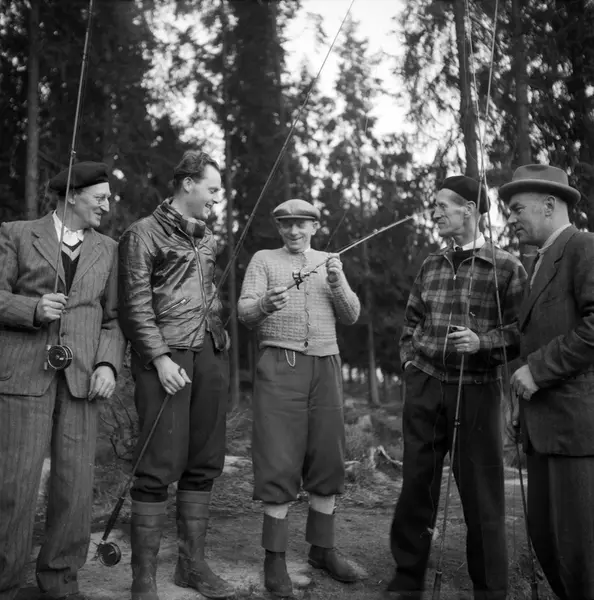 Arbeidernes Jeger- og Fiskerforening holder kurs i stangfiske ved Trollvannet. Fra venstre: Lorang Olsen, Arnfinn Gromsrud, Eugen Nilsen, Helge Andresen og Robert Ljungquist. Mai 1953.