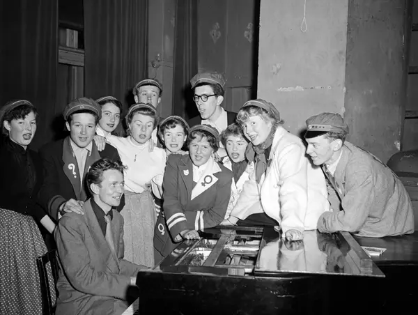 Forberedelser til russerevyen "Når byen våkner" på teatersalen i Bøndernes hus i Oslo. Ved piano sitter revyforfatteren og komponisten Einar Schanke (1927-1992). Juni 1953.