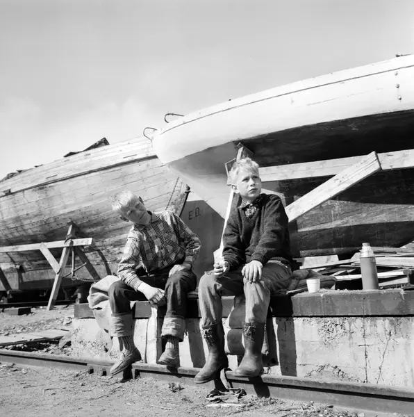 Trebåter i vinteropplag. Knut Erik Bockelie (til høyre) og klassekameraten Trond Bakkevig fra Nesbru i Asker pusser opp seilbåten Marmara. Karenslyst - Sjølyst. Mai 1960.