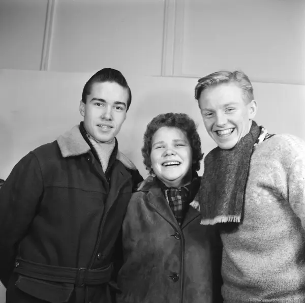 Teatergruppa på Foss skole setter opp "Den spanske flue" 3. juledag 1959. Fra venstre: Erik Østby - senere TV-produsent i NRK. Eirin Sæther - senere Eirin Faldet, stortingsrepresentant for Arbeiderpartiet. Stein Roger Bull - senere produsent og filmregissør for blant annet NRK.