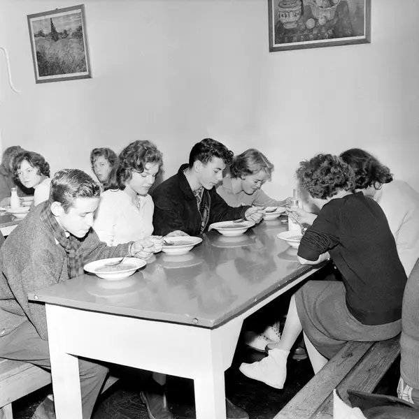 Det store kullet fra 1946 skaper kapasitesproblemer for videregående skoler i Oslo. Dette førte til opprettelse av 12 nye realskoleklasser med undervisning på ettermiddag/kveld. Her får kveldsskoleelevene på Foss skole servert middag. Januar 1960.