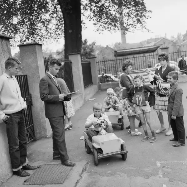 Sagene skole fyller 100 år og arrangerer tråbil-løp i skolegården for elevene. Stein Tormod Larsen i tråbilen foran i bildet. Lærer Finn Johannessen til venstre. Juni 1961.