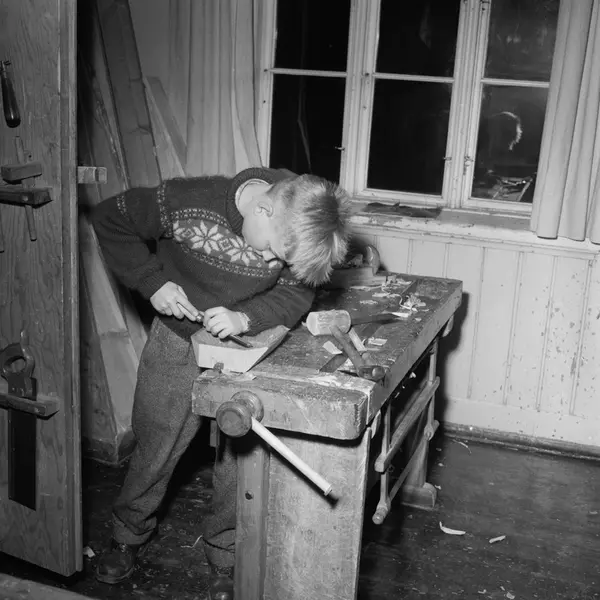 Fritidsaktiviteter for elevene ved Sagene Skole. "Stikk-innom-klubben" frister med forskjellige tilbud etter skoletid. Roger Eriksen i arbeid ved høvelbenken. November 1957.