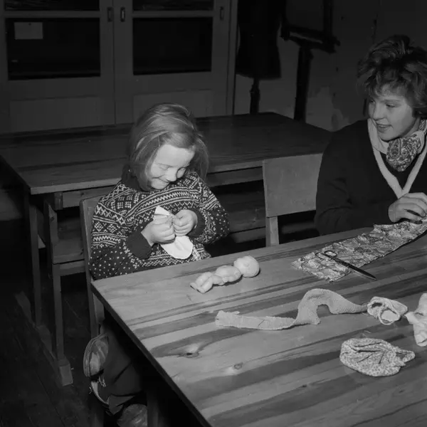 Fritidsaktiviteter for elevene ved Sagene Skole. "Stikk-innom-klubben" frister med forskjellige tilbud etter skoletid. Turid Bergmann syr skjørt til dukken sin. November 1957.