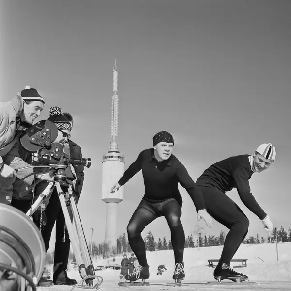Opptak på Tryvann stadion til den nordiske underholdningsserien Prospektkortet. Fra venstre: filmfotograf János Csak, produsent Erik Diesen, ukjent, Arne Bendiksen og Knut «Kupper'n» Johannesen. Mars 1963
