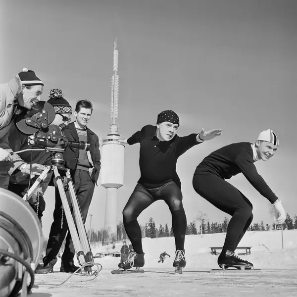 Opptak på Tryvann stadion til den nordiske underholdningsserien Prospektkortet. Fra venstre: filmfotograf János Csak, produsent Erik Diesen, ukjent, Arne Bendiksen og Knut «Kupper'n» Johannesen. Mars 1963