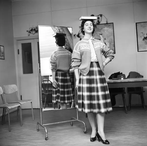 Elev ved varemagasinet Brødrene Doblougs bedriftbutikkskole lærer seg "pen gange og riktig holdning" ved hjelp av speil og å balansere en bok på hodet. April 1959.