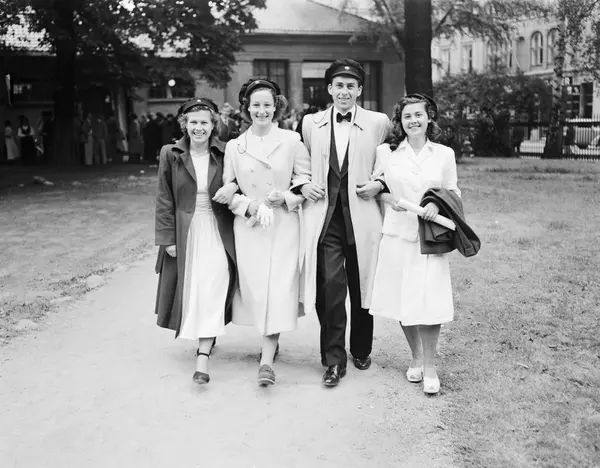 Studentene (fra v.) Kari Nytrøen, Karen Sofie Styrmo, Steen Sørensen og Veslemøy Luuhr under immatrikuleringen ved Universitetet i Oslo. Universitetshagen. September 1949.