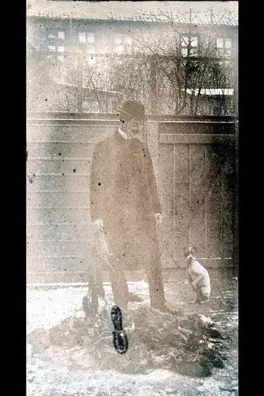Mann og hund, studerer en haug med døde rotter? Komiteen for Rottekrigen 1930. Lysbilde sannsynligvis benyttet i foredrags- og informasjonsvirksomhet i bekjempelse av rotteplagen.