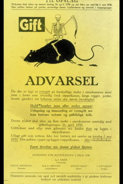 Plakat med advarsel om utlagt rottegift. Komiteen for Rottekrigen 1930. Lysbilde sannsynligvis benyttet i foredrags- og informasjonsvirksomhet i bekjempelse av rotteplagen.