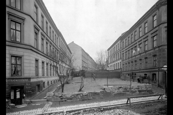 Parti fra Oslo Vaaren 1899. Kvartalet mellom Egedes og Oslo gade. Arups gade blev Reguleret 23. jan 1877 og Gadens nederste del er fullt bebygget paa begge Sider for ca. 20 Aar siden. Gaden er afstengt for al Trafik, med? dobbelt Gjærde, saaledes at de der bor ovenfor Gjærdet maa passere op Arups Gade til Egedes Gade, bort denne Gaden og ned St. Halvars- og Oslo Gade, for at naa til Udløpet af Arups Gade - den Gade de selv bebor.