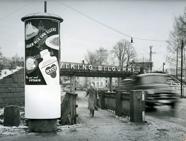 Reklametårn fra Sporveisannonsene A/S med reklame for Nyco Fruktsalt. Trafikkmiljø med lastebil som "suser forbi", fotgjenger på fortau. Reklame for Viking Bilgummi på rekkeverket på jerbaneovergang.