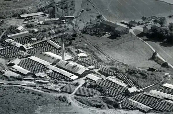 A/S Hovind Gaard & Teglverk. Hovin Teglverk ved Søndre Hovin gård, til høyre i bildet. (Flyfoto)Helt oppe i høyre bildekant sees en liten snipp av leireuttaket til Hovin tegleverk.Nede i høyre bildekant et opphøyet hus der leiren ble eltet til riktig konsistens for deretter å bli formet til murstener.Ser man litt opp til høyre for dette huset sees vaggene som leiren ble fraktet med. Tar man utgangspunkt i øverste bildekant til venstre og en tredel mot høyre, ser man en stor haug med Lecakuler, som ble produsert her. Hovinbekken (med smal bru over) til høyre i bildets nederkant.