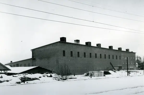 Teglverksbygning med piper fra brennovner, med jernbanelinje i forgrunnen. Opprinnelige opplysninger om "Hovin Teglverk på Søndre Hovin gård. A/S Hovind Gaard & Teglverk" er sannsynligvis ikke korrekt.