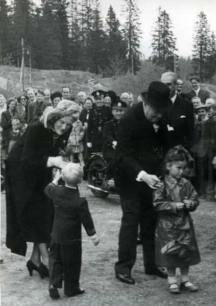 Statsminister Winston Churchill og Mrs. Churchill mottar blomster av barn ved besøk i Oslo 13. mai 1948. Feststemte tilskuere med norske flagg i bakgrunnen. Bildet er trolig tatt på Frognerseteren.