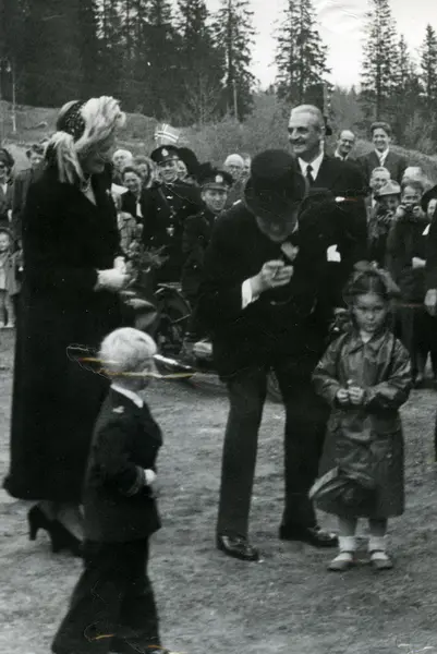 Statsminister Winston Churchill og Mrs. Churchill mottar blomster av barn ved besøk i Oslo 13. mai 1948. Feststemte tilskuere med norske flagg i bakgrunnen. Bildet er trolig tatt på Frognerseteren.
