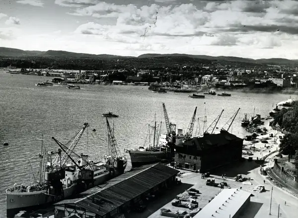 Vippetangkaia og Akershuskaia med pakkhus og skip som ligger til lossing. Utsikt over mot Filipstad og Tjuvholmen. Dampbåter på fjorden. Fiskehallen og Akeshusstranda 35. Havnemiljø.
