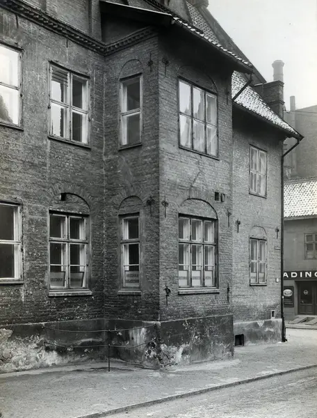 Garnisonssykehuset ( Rådmannsgården) i Rådhusgata med hovedfasaden. Eldste bevarte bygning fra den opprinnelige kvadraturen, eldste fløy fra 1626. Sykehus i 1850-årene. Kjøpt av kommumen i 1897, kontorer for Kristiania Elektrisitetsverk. Nedre Slottsgate inn til høyre med butikkskilt / reklame for lekekjøretøy.