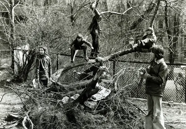 Elever samler kvist og kvas rundt felt tre. Fra "Aksjon Spire 1973" på Uranienborg skole på området mellom Harelabbveien, Briskebyveien og Skovveien (lokalnavn "Harelabben" etter planten harelabb).