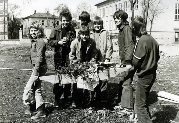 Elever bærer bort kvist og kvas. Fra "Aksjon Spire 1973" på Uranienborg skole på området mellom Harelabbveien, Briskebyveien og Skovveien (lokalnavn "Harelabben" etter planten harelabb). Skolebygninger i bakgrunnen.