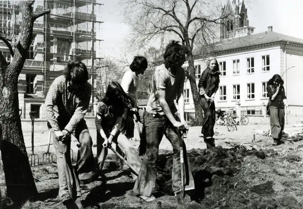 Elever spar opp og vender jord. Fra "Aksjon Spire 1973" på Uranienborg skole på området mellom Harelabbveien, Briskebyveien og Skovveien (lokalnavn "Harelabben" etter planten harelabb). Skolebygninger i bakgrunnen (hovedbygningen under opp-pussing).