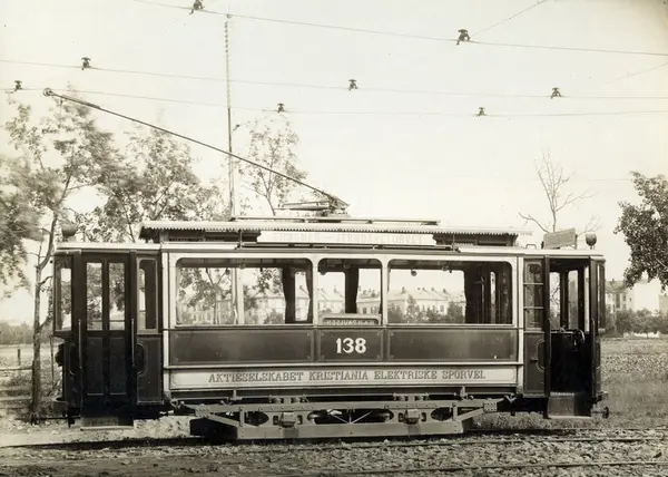Trikk / Elektrisk sporvogn (blåtrikk) på linjen Frogner - Jernbanetorget tilhørende Aktieselskapet Kristiania Elektriske Sposrvei. KES hadde alle vognhallene sine i området Gardeveien, Trudvangveien, Harald Hårfagres gate og Slemdalsveien.