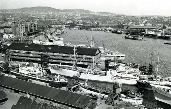 Kaiområde ved Vippetangen: Utstikker I med terminalbygg for Amerikalinjen A/L (Amerikabåt ved kai) og Utstikker II. Havnelageret ved Langbryggen bak til venstre, Kranbryggen og Nylands Verksted bak til høyre. Båter. Kraner. Lagerskur. Havnemiljø.