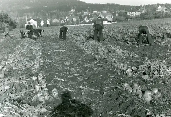 Kålrotopptaking på kommunalt dyrkingsfelt på Grefsen under krigen. Skeidbanen og Muselunden ligger på dette området i dag. Bebyggelsen i Lofthusveien og Haraldsheimveien (daværende Kringsjåveien) i bakgrunnnen. Nordre Åsen.