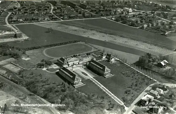 Blindern studenthjem med omkringliggende jorder (Blindernjordene), idrettsplasser og park. Meteorologisk institutt oppe til venstre. Blindernveien (ned til høyre), Niels Henrik Abels vei, Tyrihansveien, Eventyrveien og Moltke Moes vei i bakgrunnen. Postkort med nr. 8165. (Flyfoto)