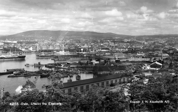 Oversiktsbilde av Grønlia, Bispevika og Bjørvika. Havnemiljø med båter, kraner, lagerskur og skipsverft (Nylands Verksted i midten). Kull-lager (Sørengbrygga). Akerselvas utløp. Havnelageret i bakgrunnen. Utsiktspunkt på Ekeberg. Postkort med nr. 4255.
