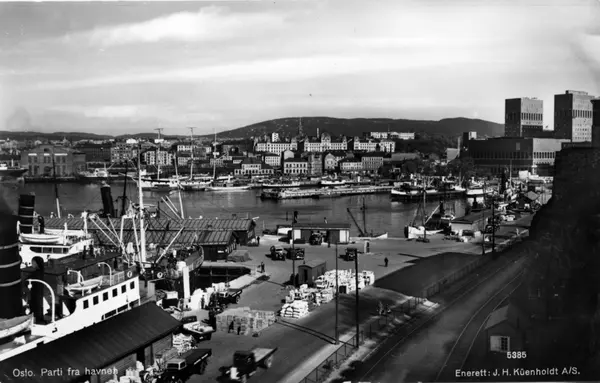 Pipervika, Rådhusbryggene og Rådhuset sett fra Akershusstranda. Havnebanen. Akershusutstikkeren. Havnemiljø med båter, kraner, gods og lagerskur.Trafikkmiljø. Gamle Vika i bakgrunnen. Postkort med nr. 5385.