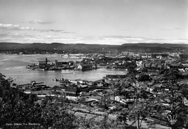Oversiktsbilde av Sørenga med Sørengkaia over mot Vippetangen og Havnelageret. Nylands Verksted i midten. Utsiktspunkt på Ekeberg. Postkort med nr. 363.