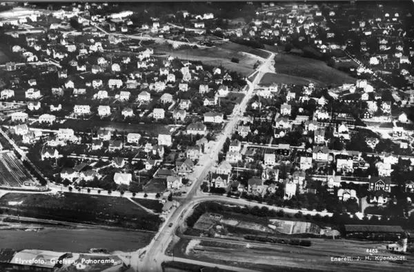 Villabebyggelse opp langs Grefsenveien med tilhørende villaveier (nord for dagens Storokrysset). Gjøvikbanen langs nedre del av bildet. Storoveien og Rolf Wickstrøms vei (begge del av Store Ringvei) ovenfor jernbanen. Postkort med nr. 4463. Flyfoto.