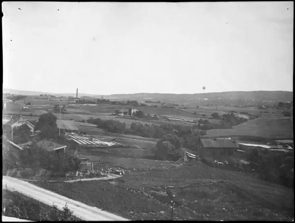Fotografert mot øst fra taket på Østre Hasle gård i Økernveien. I forgrunnen går Økernveien, med Rosengrens gartneri Sorgenfri til høyre. I bakgrunnen med pipa Akers teglverk. Til høyre for teglverket ligger Mellom-Hovin. Den hvite streken foran teglverket viser Alnabanen. Husklyngen midt på bildet er Haslelund (Rasmusjordet). Litt til høyre, i kjerret som omgir Hovinbekken, sees plassen Brovold. Dammen til høyre er Sjurdammen i Hovinbekken. Det tre-etasjes huset i forgrunnen til høyre er Hildischs garveri i Økernveien 111. Anlegget ble antagelig oppført av skomaker og garver Rødseth omkring 1880. Mer detaljert informasjon om motivet finnes.