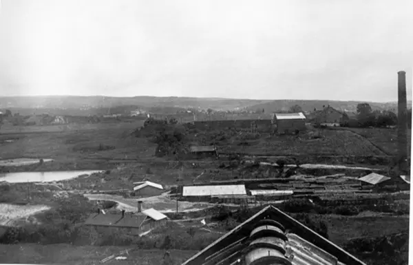 Fotografert mot øst fra taket på Østre Hasle gård i Økernveien. Til venstre Sjur-dammen, en kulp i Hovinbekken. Nede i dalen og med pipa ligger Hovin teglverk. Søndre Hovin gård ligger på åsryggen bakenfor.Mer detaljert informasjon om motivet finnes.