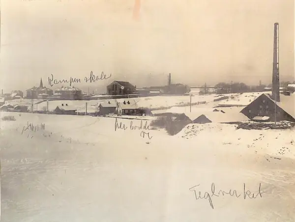 Plassen Lilleberg i midten, ved nåværende Gladengveien, i krysset ved Ensjøveien (tidigere trasé). Grønvold (Lenschow) teglverk til høyre. Kampen skole i bakgrunnen til venstre. Industribygninger (?) i midten.