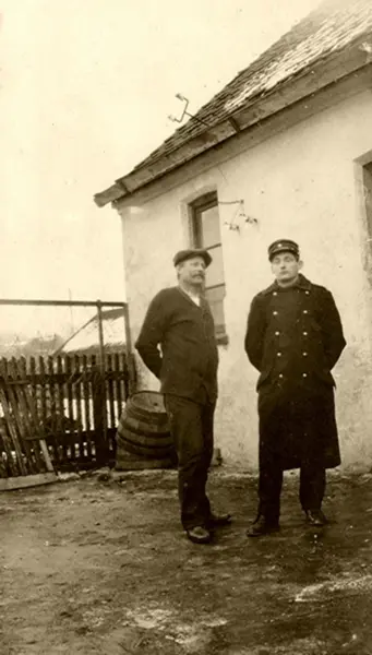Fra plassen Lilleberg, ved nåværende Gladengveien, i krysset ved Ensjøveien (tidigere trasé). Teglverksformann Svend Nielsen, Grønvold (Lenschow) teglverk med sønnen Anders William (i uniform).
