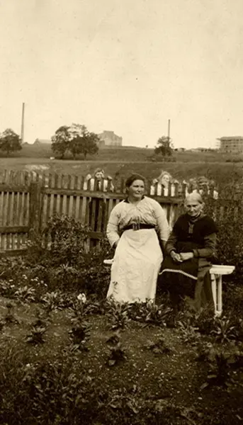 Fra plassen Lilleberg, ved nåværende Gladengveien, i krysset ved Ensjøveien (tidigere trasé). Anna Nielsen, gift med teglverksformann Svend Nielsen, Grønvold (Lenschow) teglverk). Grønvold i bakgrunnen.