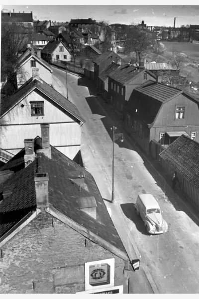 Trehusbebyggelse oppver Maridalsveien sett fra krysset ved Griffenfeldts gate. Myraløkka i bakgrunnen til høyre. Bildet er tatt fra tårnblokken i Griffenfeldts gate 12. Lyktestolper, bil.