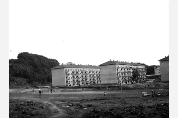 Friområde med barn på fotballbane i forgrunn, boligblokker i Telavåggata. Bildet må være tatt tidligst 1948. Disse to blokkene ble bygget i 1947 og 1948.