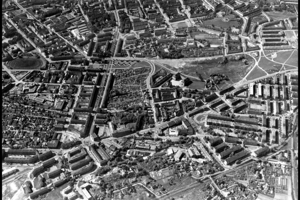 Ppanorama over Carl Berners plass, Sinsen, Torshovdalen. Rodeløkkens kolonihager, Torshovdalen til høyre. Sinsenbyen, Rodeløkka, Rosenhoff. Nær venstre bildekant kan man se Dælenenga idrettsplass. Antakelig fotografert tidlig på 1950-tallet (Flyfoto)