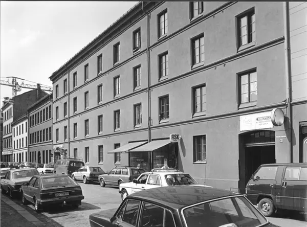 Rehabiliterte bygårder. Opp-pussede fasader i puss, Thorvald Meyers gate 85 L (hjørnegård) og Leirfallsgata 10 (bortenfor). NORFRA-FISK, fisk og viltbutikk.