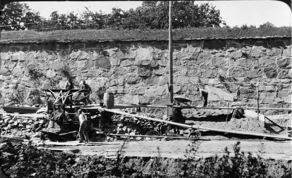 Sementblandermaskin? / Sementblandingsmaskin? Gjenfylling og gjenstøpning av kloakkrørgrøft (hovedkloakk) i nedre Kongens gate. Østre festningsmur. Fra 1920-tallet.